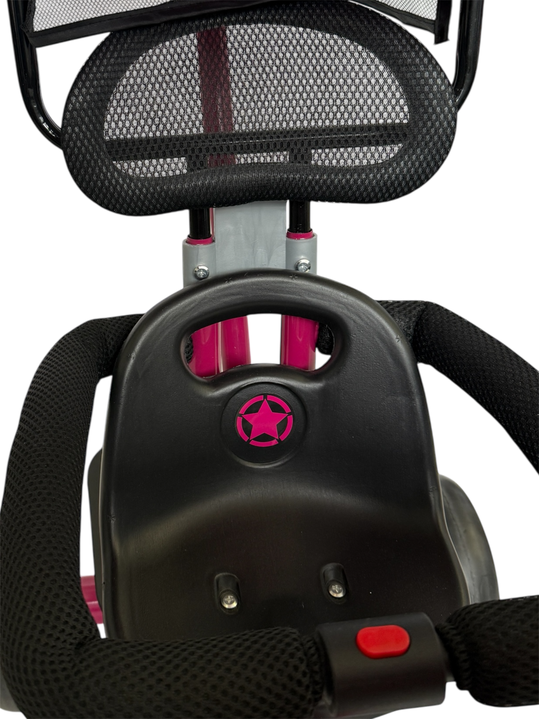 El Star Wheels combina seguridad, comodidad y entretenimiento en un diseño resistente y moderno. Su estructura metálica ofrece estabilidad, mientras que el asiento con cabecera ajustable, la barra de seguridad desmontable y el reposapiés garantizan un paseo cómodo y protegido.